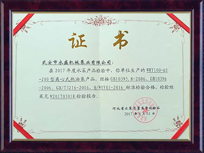 離心式熱油泵合格證書